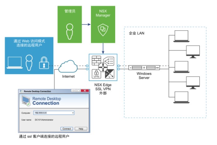 SSL VPN-Plus概覽使用SSL VPN-Plus,遠(yuǎn)程用戶可以安全地連接到 NSX Edge 網(wǎng)關(guān)后面的專用網(wǎng)絡(luò)。遠(yuǎn)程用戶可以在專用網(wǎng)絡(luò)內(nèi)訪問服務(wù)器和應(yīng)用程序。