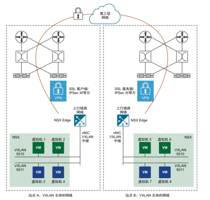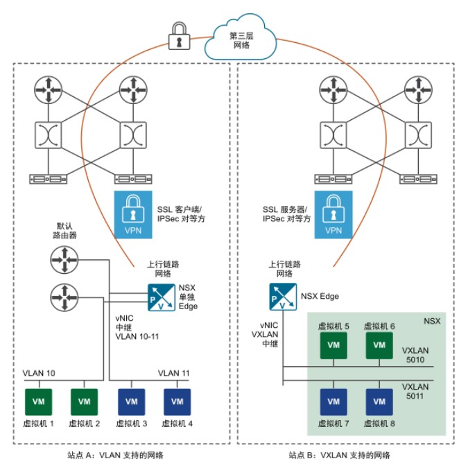 因此,使用 L2 VPN 服務(wù),企業(yè)可以在不同的物理站點(diǎn)之間無縫遷移工作負(fù)載。工作負(fù)載可以在基于 VXLAN 的網(wǎng)絡(luò)或者基于 VLAN 的網(wǎng)絡(luò)上運(yùn)行。對于云服務(wù)提供商而言,L2 VPN 提供了一種加入租戶的機(jī)制,而無需修改工作負(fù)載和應(yīng)用程序的現(xiàn)有 IP 地址。