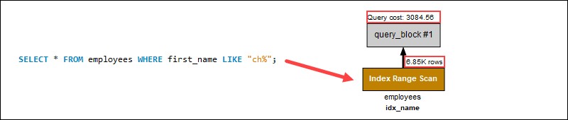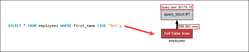 搜索開頭的通配符不應(yīng)用索引。相反,全表掃描單獨(dú)搜索每一行,增加了該過程中的查詢成本。在示例查詢中,