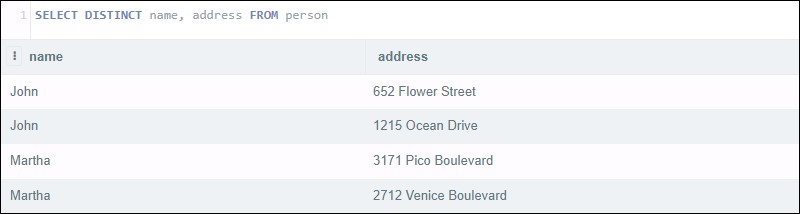 該聲明似乎應(yīng)該返回一個不同名稱的列表及其地址。相反,查詢同時查看名稱和地址列。雖然有兩對同名的客戶,但他們的地址不同。