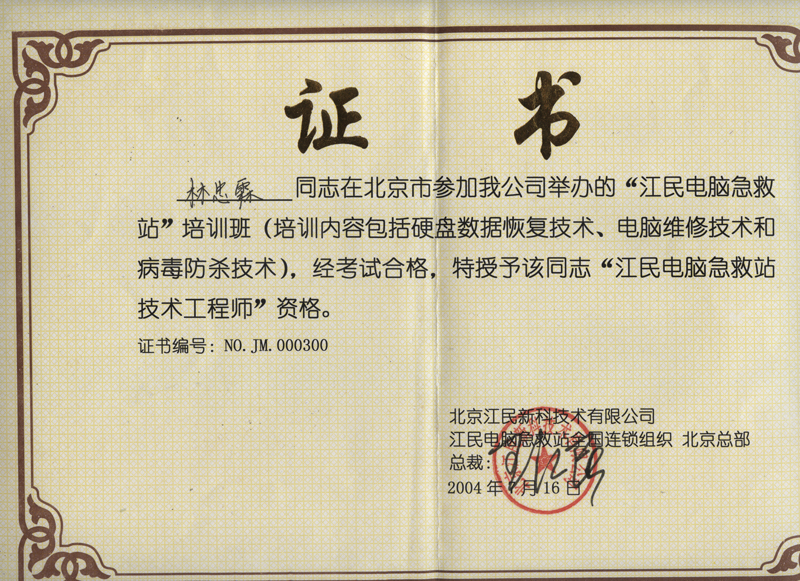 這次數(shù)據(jù)恢復(fù)對我觸動(dòng)更大的是:它讓我看到了這項(xiàng)業(yè)務(wù)技術(shù)很欠缺,但市場很有需求,同時(shí)擁有這項(xiàng)技術(shù)也是利人利己的本領(lǐng)。于是,我下決心沿著條路走下去。常言道:打鐵還需自身硬,為此,我專程參與多地技術(shù)精英培訓(xùn)學(xué)習(xí),先后獲得北京“江民電腦急救站技術(shù)工程師”的資格證書(數(shù)據(jù)恢復(fù)病毒防御專業(yè))、效率源國際數(shù)據(jù)恢復(fù)中心確認(rèn)頒發(fā)的“數(shù)據(jù)恢復(fù)工程師”的證書等。