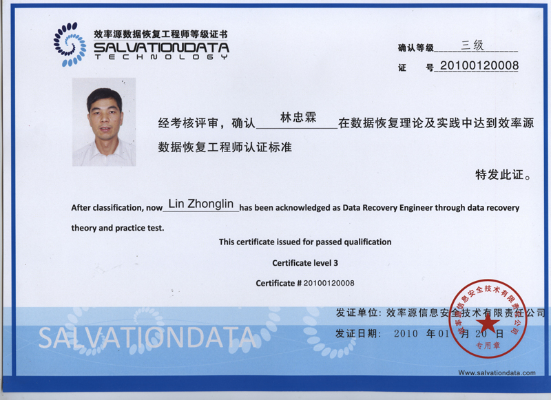 后獲得北京“江民電腦急救站技術(shù)工程師”的資格證書(數(shù)據(jù)恢復(fù)病毒防御專業(yè))、效率源國際數(shù)據(jù)恢復(fù)中心確認頒發(fā)的“數(shù)