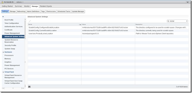 現(xiàn)在我們有了一個(gè)新的VMware Tools 文件共享位置,選擇一個(gè)主機(jī),轉(zhuǎn)到Manage > Settings >Advanced System Settings > UserVars.ProductLockerLocation。